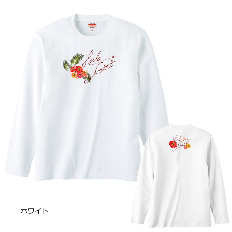 - レディースM対応(タグ表記男女兼用S)/ホワイト*ハイビスカス&【Hula Girl】*長袖/Tシャツ/フラダンス/ハワイ/送料無料【tl035】