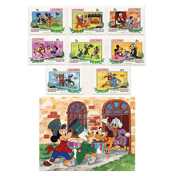 - ディズニー ミッキー ドナルド スクルージ 切手/小型シート1枚&切手8枚(オールドクリスマス) 発行国Lesotho 1983年発行 新品