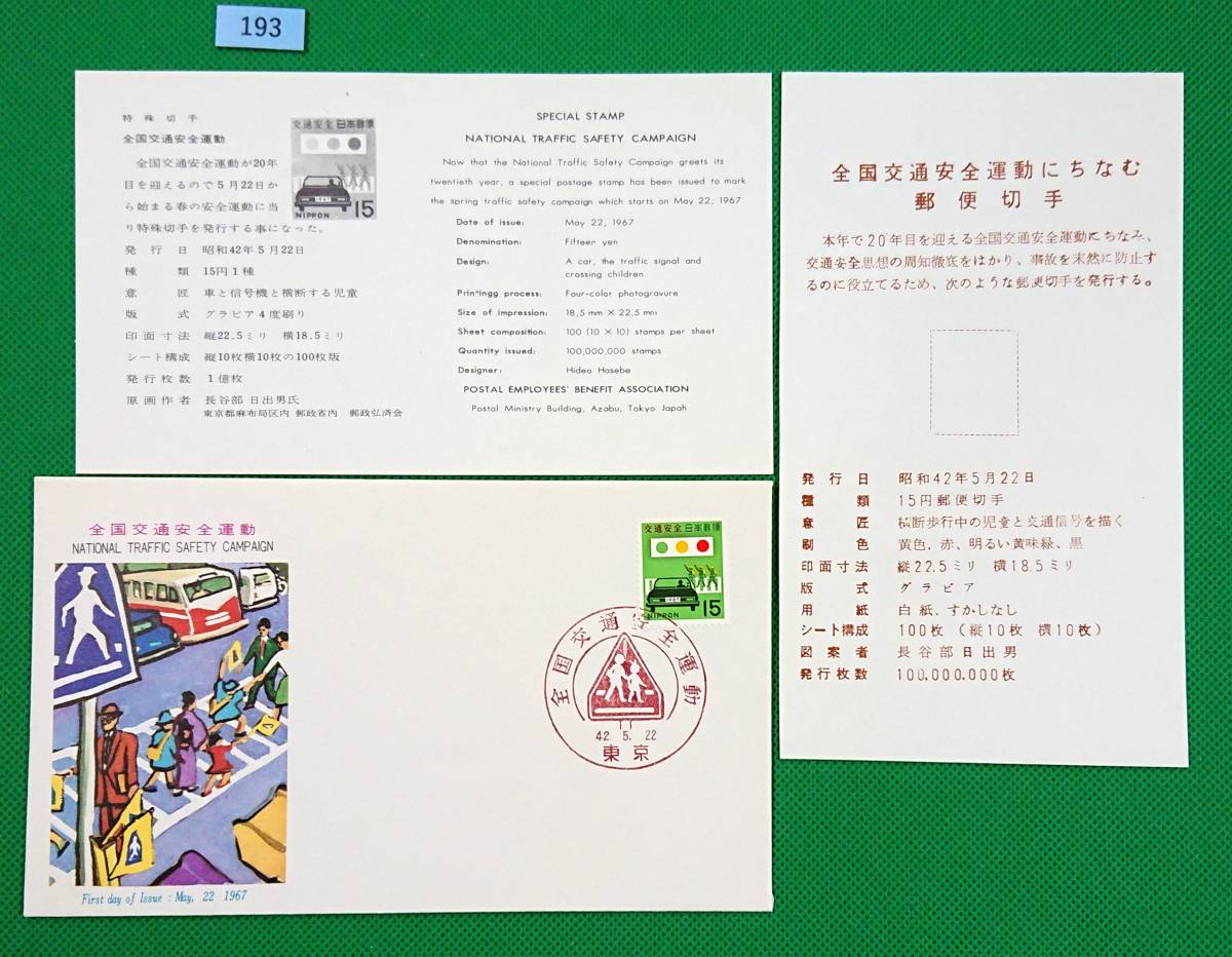 - FDC/美品/ア/全国交通安全/初日印/東京記念印/郵政弘済会/解説書有り/1967年5月22日/初日カバー №193