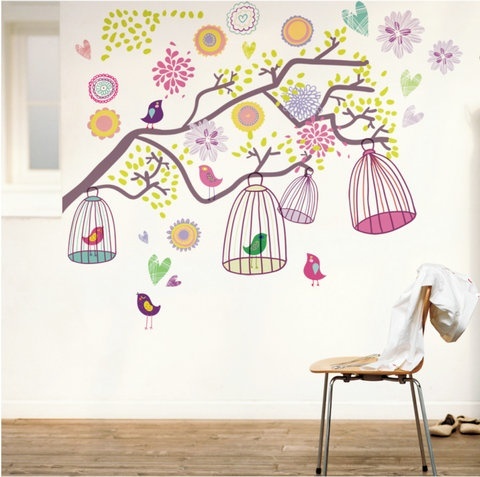 - ウォールステッカー 鳥かご 花 木の枝 カラフル 紫 壁紙シール かわいい フラワー 綺麗に剥がす ハート 姫系 ワンルーム 病院 ギフト