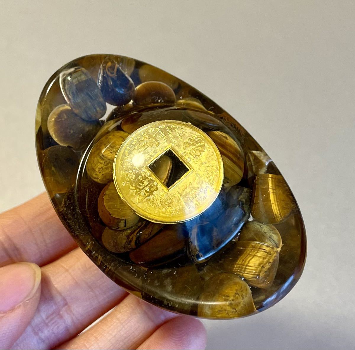 - 元宝のオルゴナイト タイガーアイ 天然石 パワーストーン 置物インテリア 銀錠 風水晶 魔除 お守 金運 財運 幸運 ラッキー