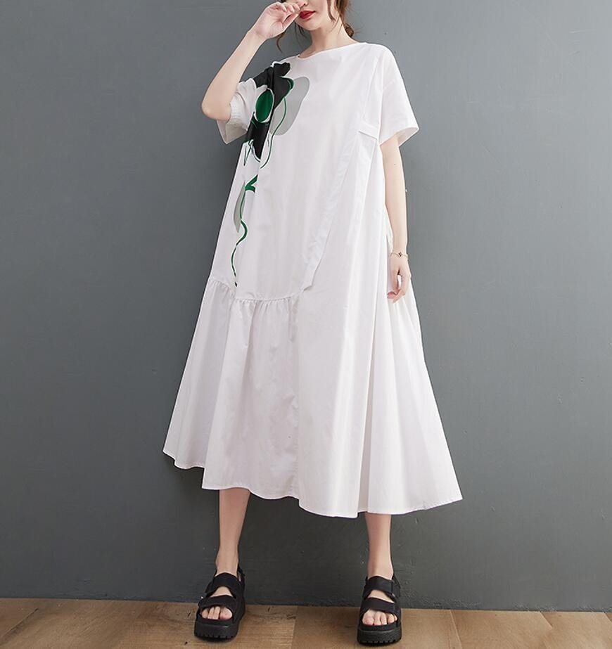 - 夏新品 ワンピース レディース 半袖 体型カバー プリント ロングワンピース シンプル きれいめ★白/XLサイズ