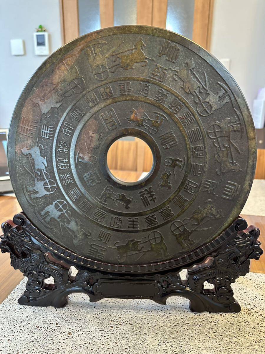 - V-624 天然玉石 古玉 老玉 玉壁 大型 馬拉車の図案 置物 風水 お守り