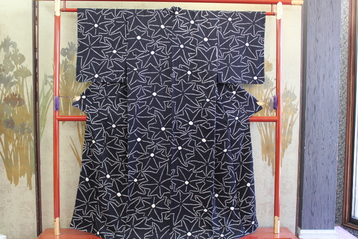 > きもの今昔6395 小紋のきもの 広衿袷手縫い仕立て 正絹綸子地高級手絞り黒地の小紋 身丈153cm