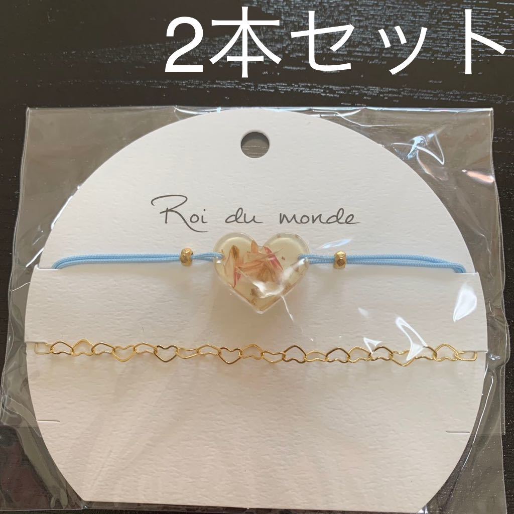 - 花びら入り ハートストーン チェーン ブレスレット 2本セット 水色