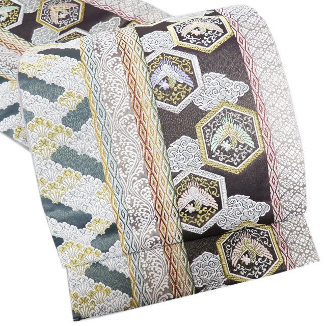 - 袋帯 中古 リサイクル 正絹 フォーマル 仕立て上がり 六通 鳳凰亀甲文 飛雲 波立涌 菱文 金通し 多色 金銀 きもの北條 A977-11