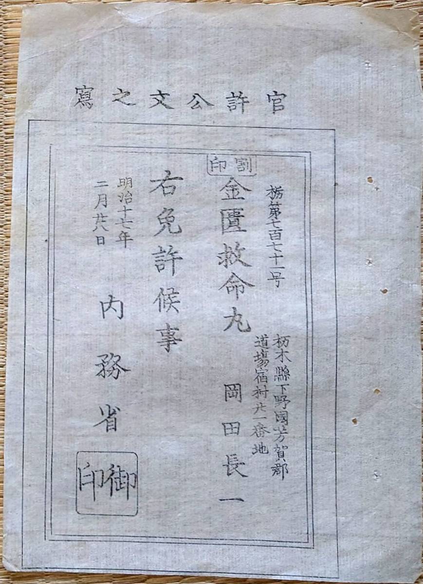 - f24021304〇和紙 木版 薬 金匱救命丸 免許 官許公文書写 内務省 栃木県芳賀郡道場宿村 明治17年〇和本古書古文書