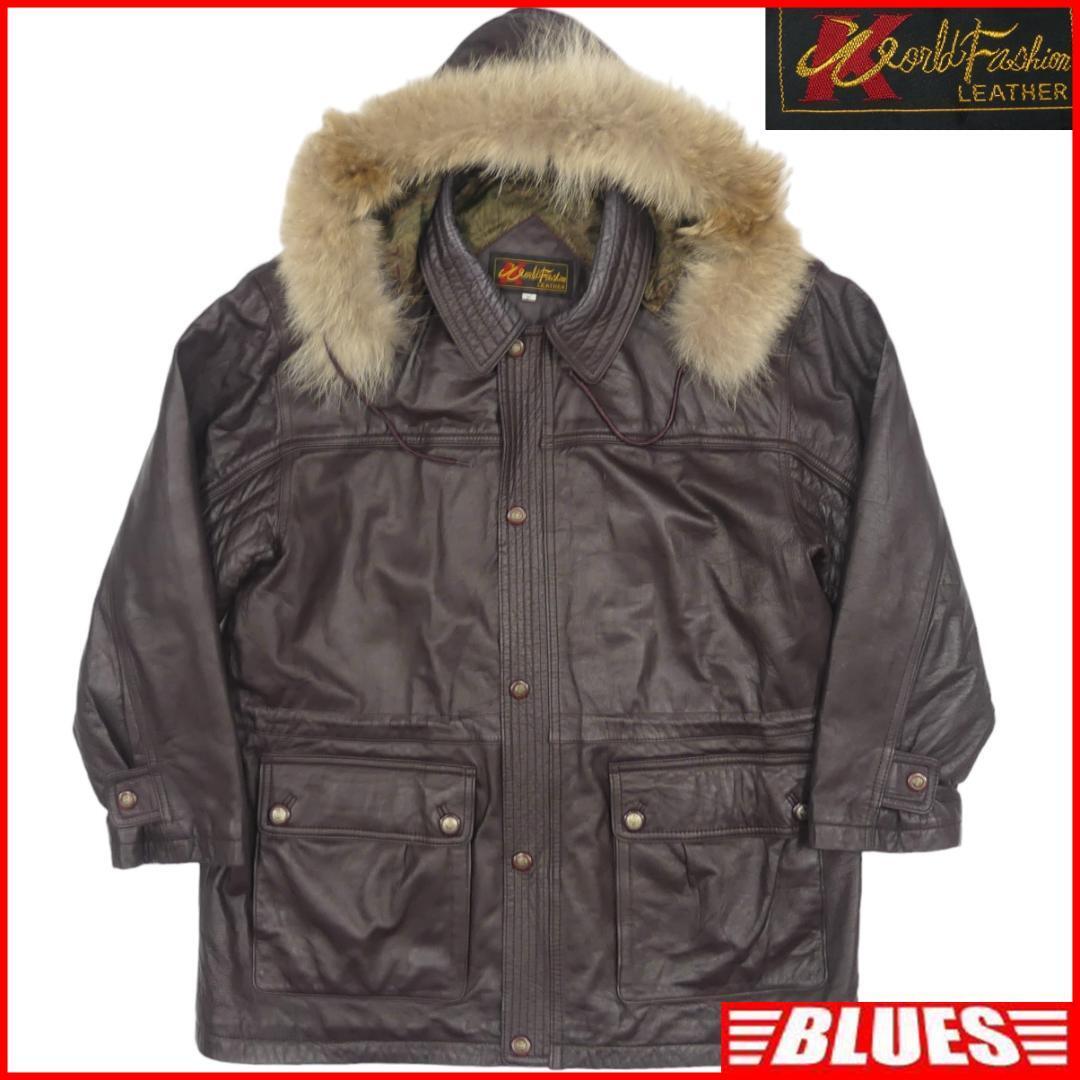 > 即決★World Fashion★メンズL レザーステンカラーコート ワールドファッション 茶 ファーフード 裏地総柄 中綿 本革 本皮