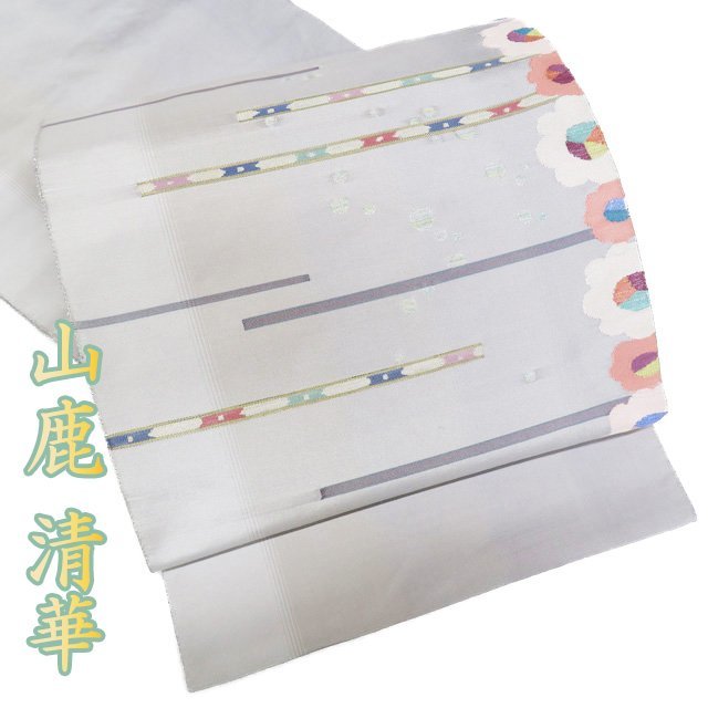 > 特選 袋帯 中古 リサイクル 正絹 カジュアル 仕立て上がり お太鼓柄 染色作家 山鹿清華 花模様 小町鼠色 多色 きもの北條 A981-16