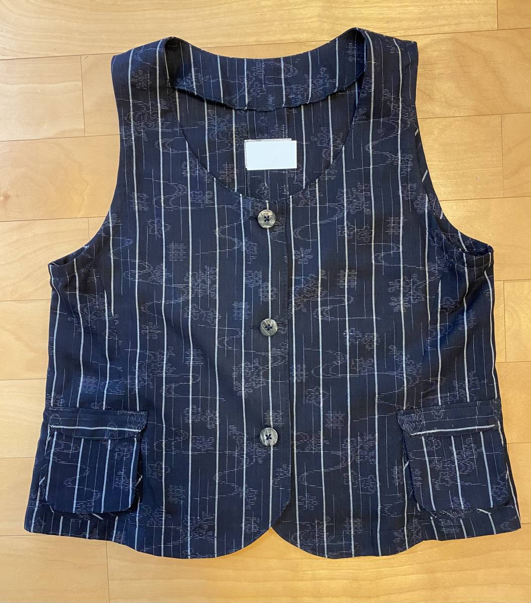 - ☆即決☆ 古布100% 着物リメイク 絣ベスト 縞 柄入り 濃紺 百貨店