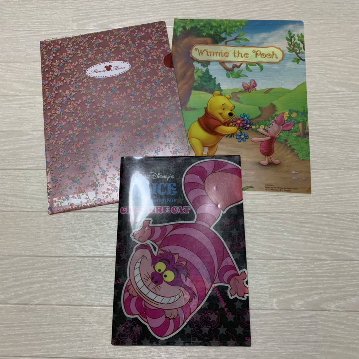 > ディズニー クリアファイル 3点セット ミニー プーさん チシャ猫 赤 黄 黒 Disney Minnie Pooh ALICE 文房具 A4サイズ cat アリス