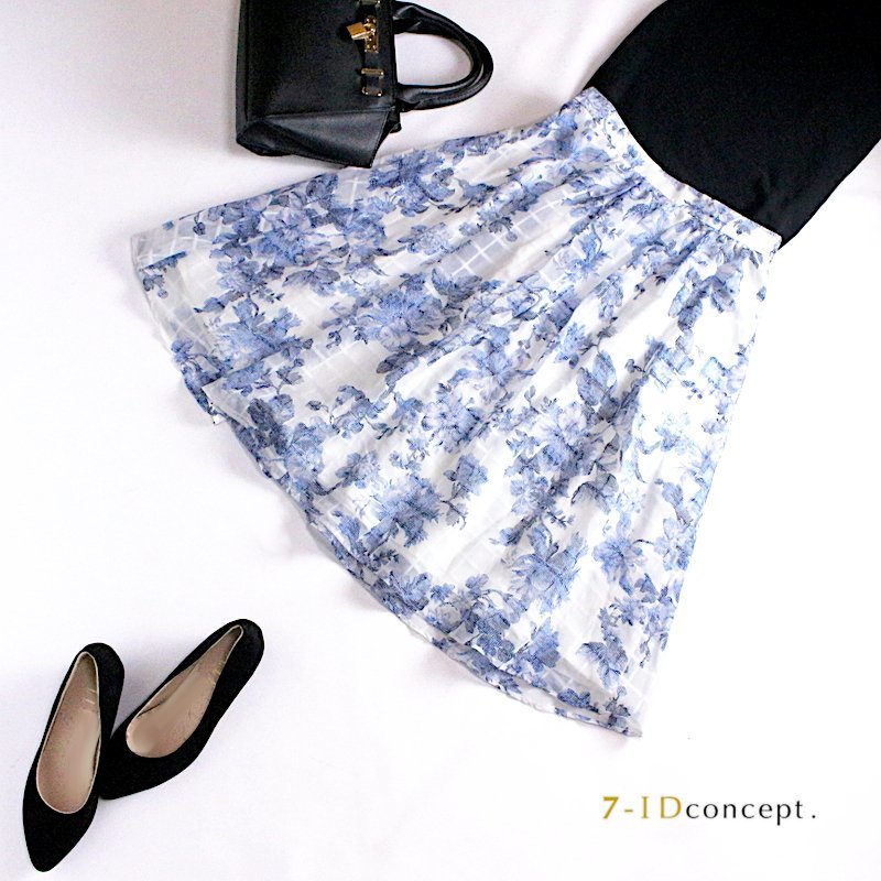 - 美品 7-Idconcept 7-IDコンセプト ■ 春 夏 上品 透け オーガンジー ぼかし フラワー 膝下丈 フレアスカート 38 9号 ホワイト 白 ブルー 青