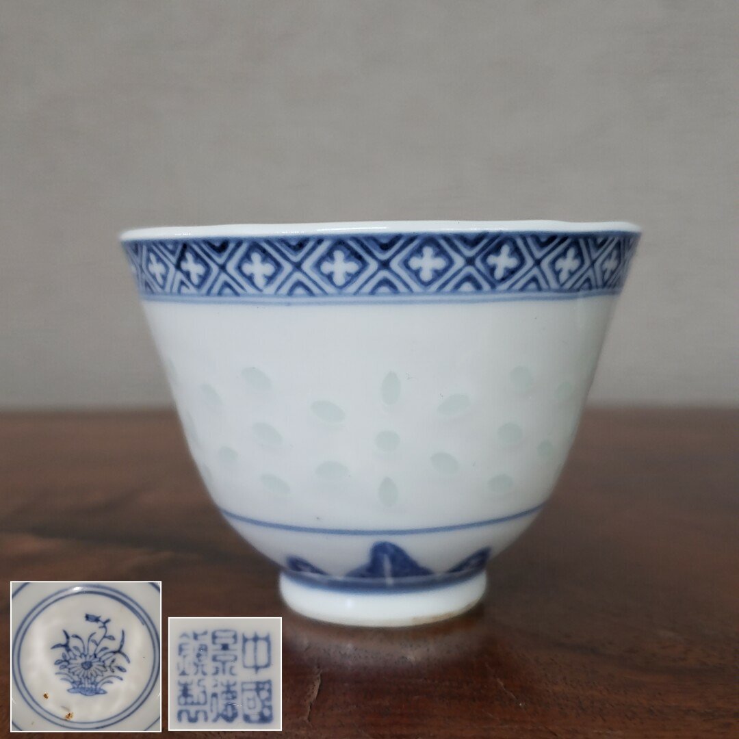 - 中國景徳鎮 湯呑 1客 蛍透かし 中國 景徳鎮 茶器 湯呑 湯呑み 中国茶 飲茶 ホタル透かし 透かし細工 染付 中国磁器【60s2313】