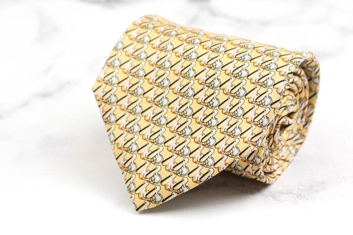 > サルヴァトーレフェラガモ シルク 総柄 動物柄 鳥 ペリカン イタリア製 ブランド ネクタイ メンズ ベージュ 良品 Salvatore Ferragamo