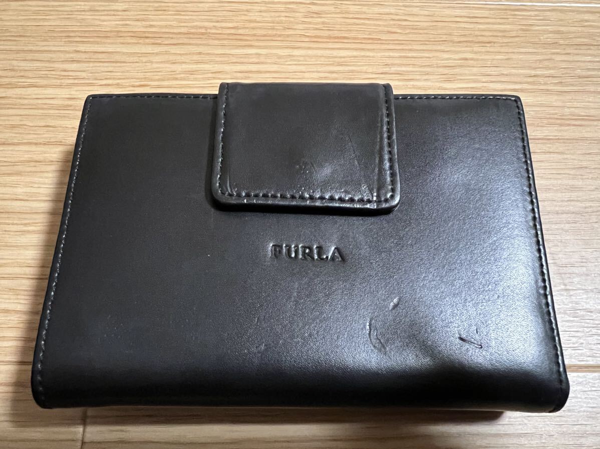 - FURLA フルラ 二つ折り財布 レザー ブラック 黒 中古