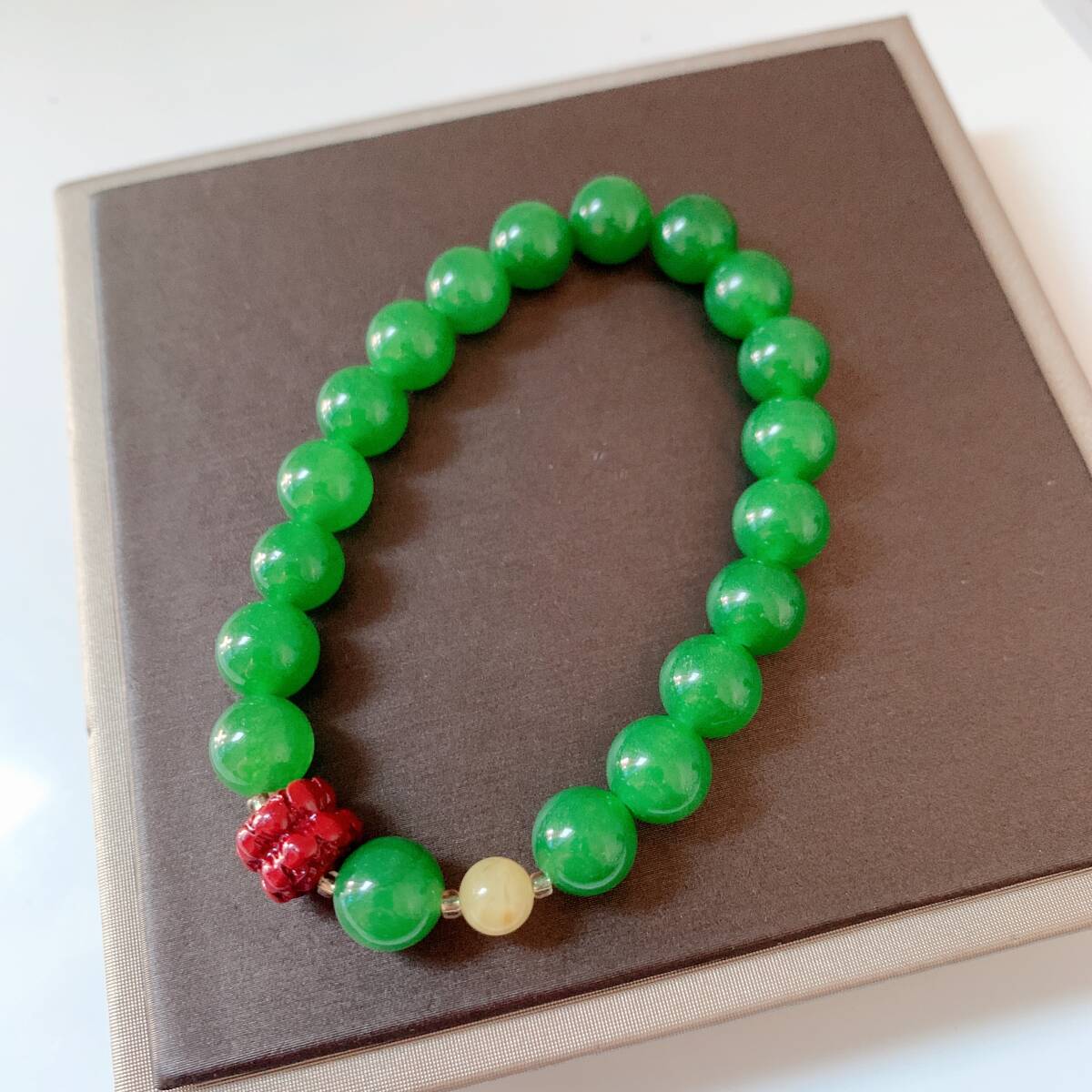 > ◇台湾碧玉+シナバー(辰砂)1粒+蜜蝋琥珀1粒◇ブレスレット◇パワーストーン◇巾着袋付き◇プレゼント015B31808