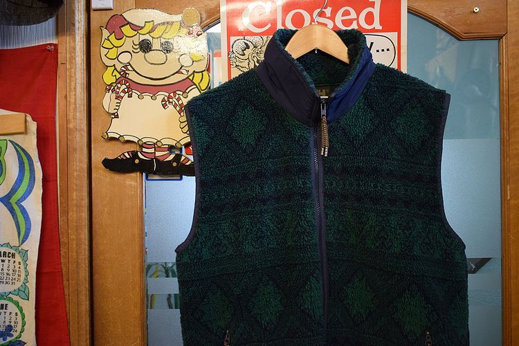 > グッドデザインUSA製アメリカ製ビンテージHelly HansenヘリーハンセンフルジップフリースベストL緑総柄アメカジアウトドアストリートh23310