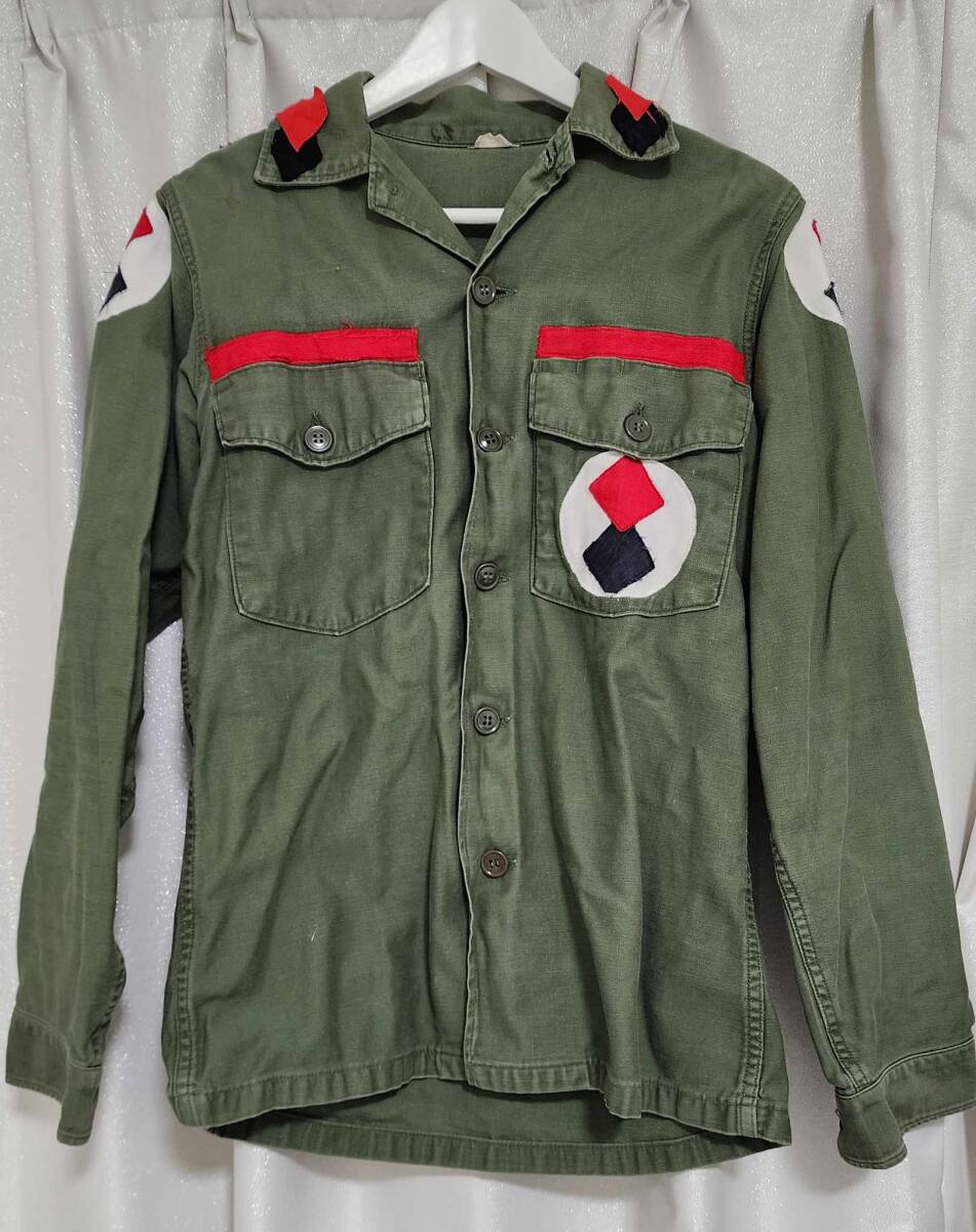 - US米軍ヴィンテージシャツ ダイヤデザイン柄 アーミーグリーン 希少品