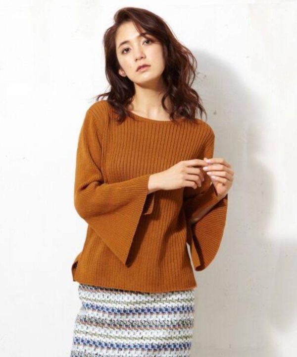 - 23区コットン100%フレア袖長袖ニットトップスブラウンカジュアル 袖口裾両サイドスリット有 38 C9036