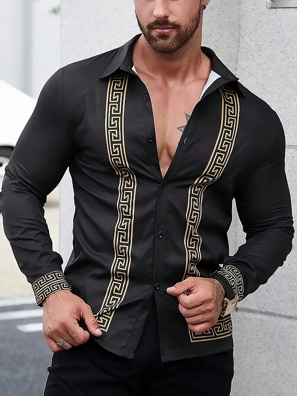 - グレカ柄 長袖シャツ 黒 052 シンプル Yシャツ ドレスシャツ ヤクザ ヤンキー オラオラ系 ホスト スーツ スタイル 服 メンズ ファッション