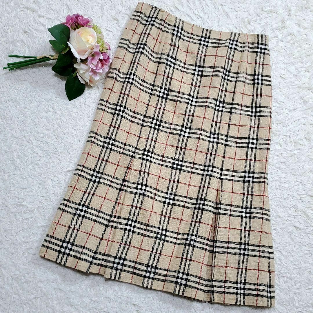 > 極美品 4L バーバリー シルク ウール リネン プリーツ スカート ベージュ 大きいサイズ ノバチェック BURBERRY 絹 大きいサイズ 3XL 46