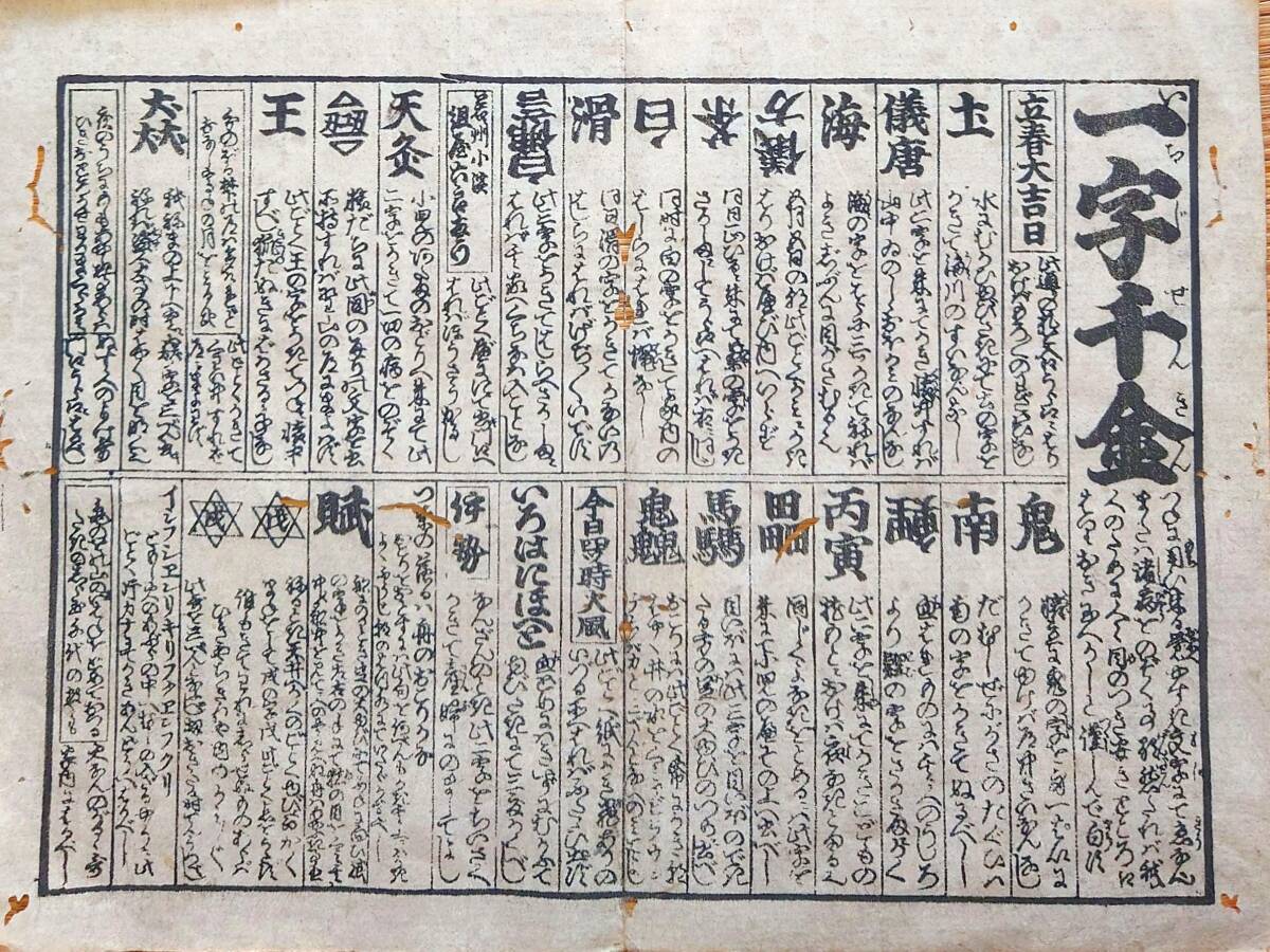 > f240409106〇一枚刷り 浪花みやげ初編 一字千金 立春大吉日 ことば遊び しゃれ なぞ 判じ絵 見立番付 天保年間 塩屋喜兵衛板〇和本古書