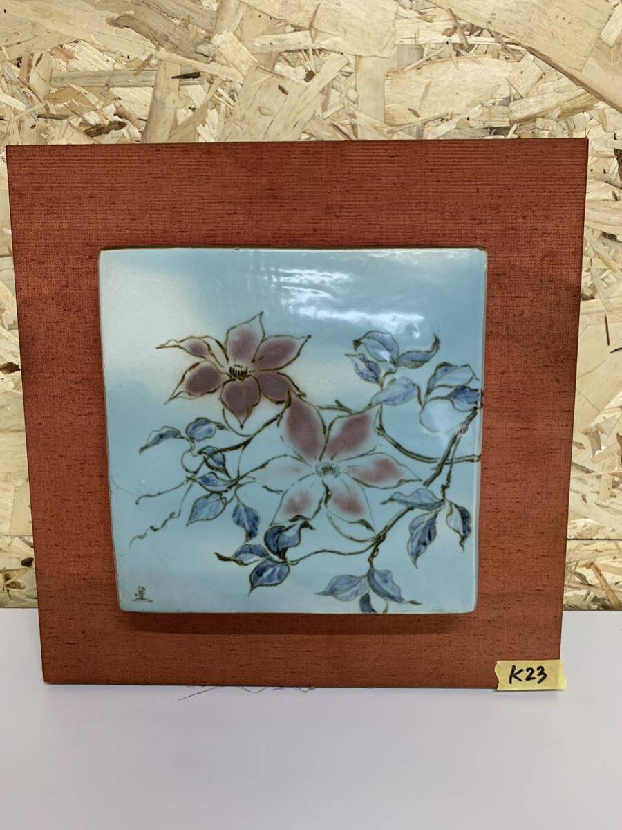 > 【陶板】 高井進 陶芸家 陶芸 花 壁掛け 美術品 インテリア 約35×35 作品実寸22×22 K23