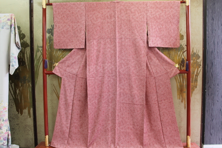 - きもの今昔6781 小紋のきもの 広衿袷手縫い仕立 正絹一越地弁柄色楓と小花の白抜き小紋 色胴裏使用 身丈155CM