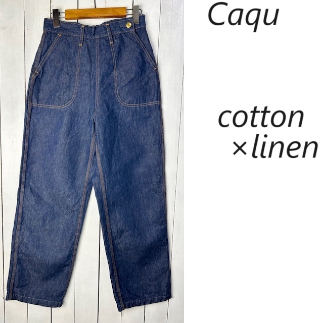 > 美品 caqu サキュウ リネンコットン サイド開きワイドファーマーデニムパンツ 0 濃紺 ワーク ライトオンス ヴィンテージルック ●405