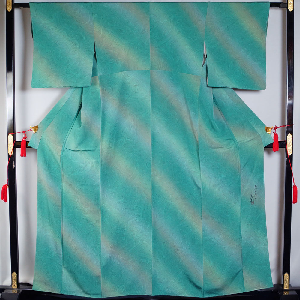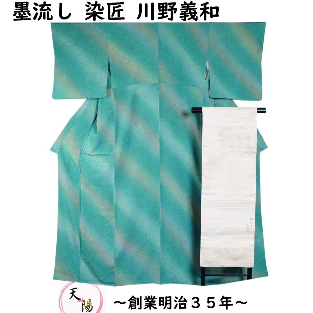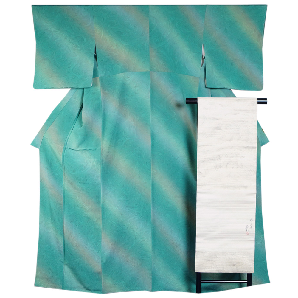 - 着物セット 墨流し 小紋・名古屋帯 2点 セット 染匠 川野義和 墨流し模様 作家物 落款有り Sサイズ リサイクル着物 中古 リサイクル小紋