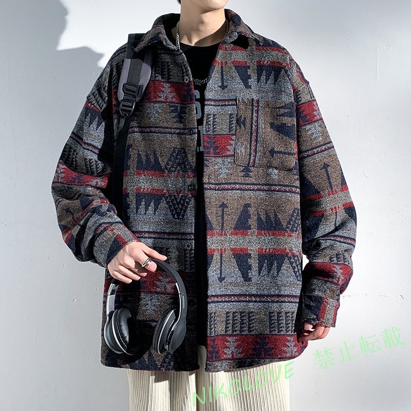 > シャツジャケット 柄物 長袖シャツ メンズ* 秋冬ジャケット ジャンパー トップス ブルゾン珈琲色 L サイズ選択可 LC970