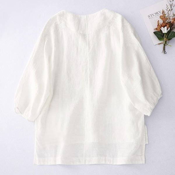 - 夏 カジュアル 刺繍り チュニック 無地 リネン 綿麻 ゆったり 大きいサイズ 七分袖 シャツブラウス LサイズK0358