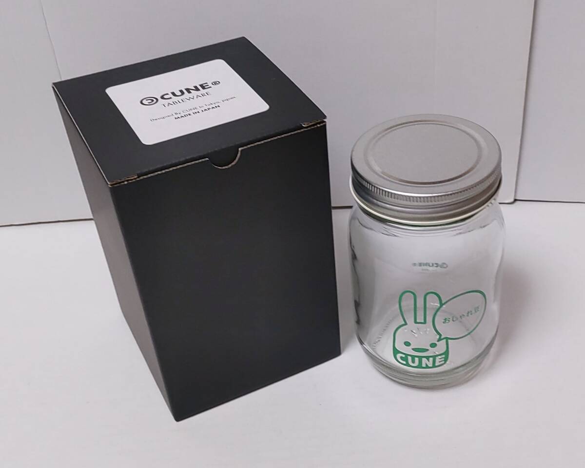 > 2019 CUNE OS限定品 日本製 保存ビン『おしゃれ豆入れ』ガラス CLEAR 二面プリント 約直径7.5×高さ13cm 箱付き※未使用品/商品タグ付き