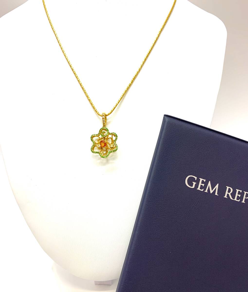 - 【送料無料】 K18金18 天然オレンジサファイア・ダイヤモンド・グリーンガーネット ネックレス 総重量 5.5 g 45cm 鑑定書付 店頭受取可