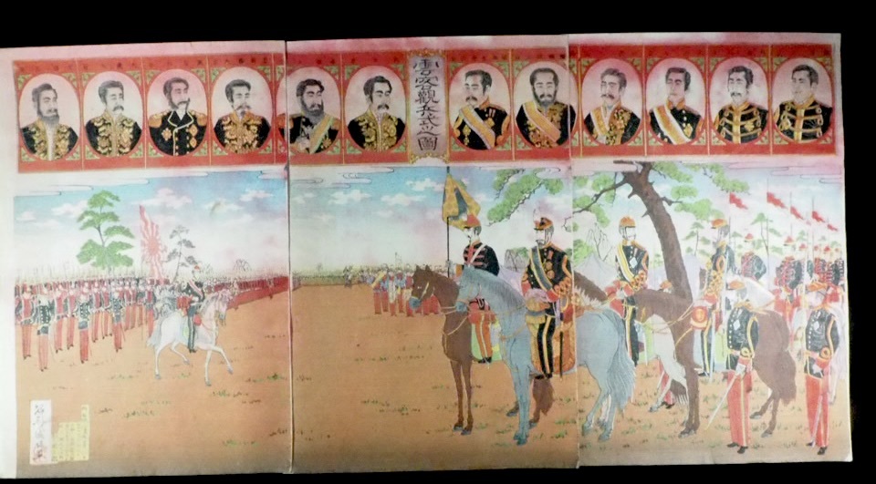 - 浮世絵木版画 錦絵 石斎国保「雲客観兵式之図」3枚綴り SMN604(20-7)