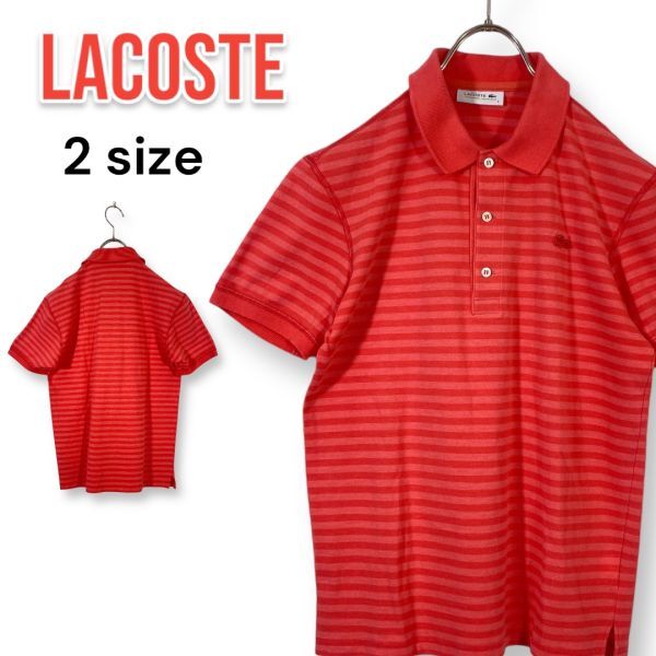> 【レアカラー】日本製 LACOSTE ラコステ 刺繍ロゴ 半袖ポロシャツ シェルボタン 鹿の子 サイズ2 サーモンピンク ボーダー 古着