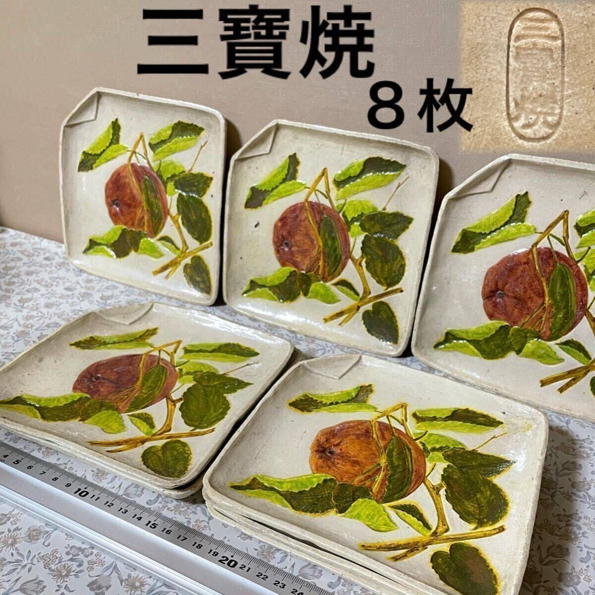 - 骨董品 三寶焼 三宝焼 時代物 年代物 角皿 四角 皿 プレート 彫刻 蜜柑色絵 フルーツ柄 時代 骨董 昭和レトロ アンティーク 食器 古道具