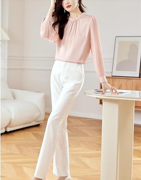 - M ブラウス 長袖 スタンドカラー ハイネック 体型カバー 無地 おしゃれ 大人 シャツ 立ち襟 フリル 通勤 オフィス ビジネス 事務服 OL
