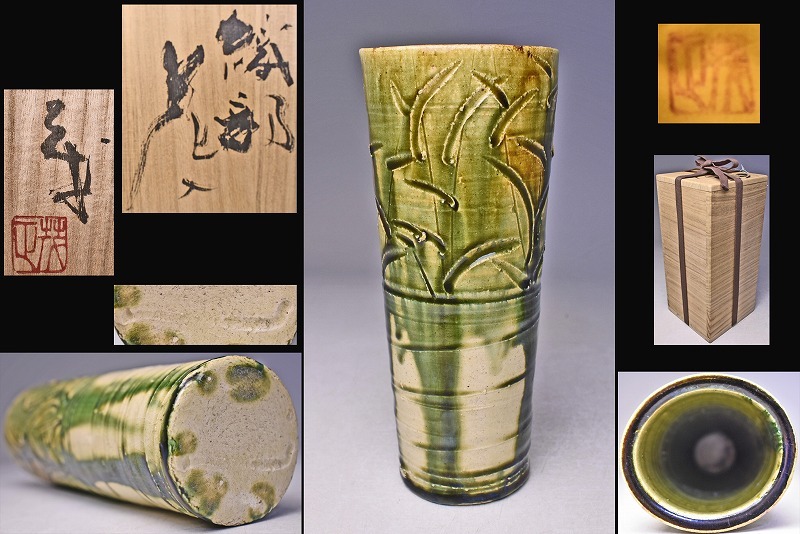 > 東田茂正 ★ 織部花入 ★ 共箱 ★ 筒型 ★ 東京で作陶 ★ 人気陶芸家 ★ 織部の濃淡も景色 ★ 彫り文様あり