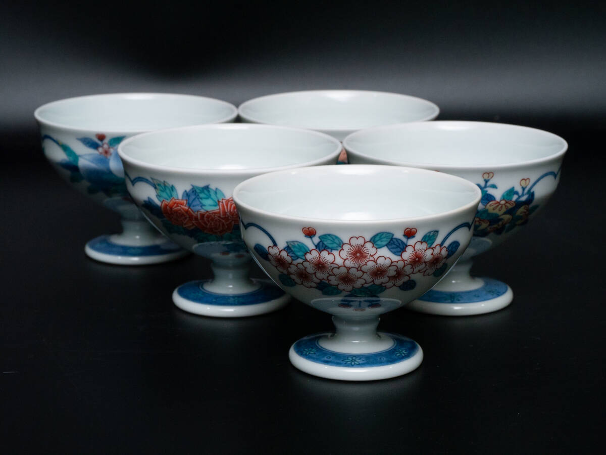 - 【値下げ交渉有り】 人間国宝 今泉今右衛門 本人作 色鍋島 絵変り 花文 高杯 盃 カップ 五客 化粧箱