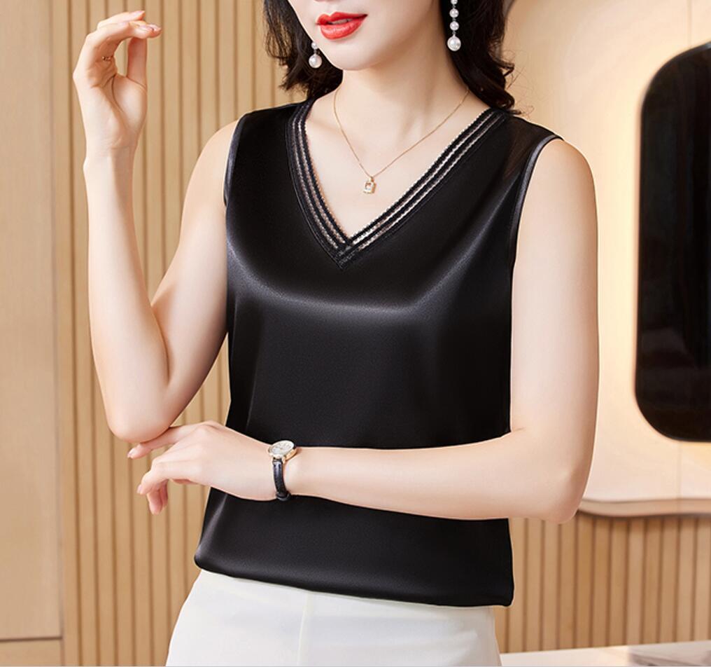 - 新入荷/ トップス ノースリーブ シャツブラウス 光沢感 Vネック カシュクール サテン風 ノースリーブ 着やせ 通勤 大人 無地 /ブラック