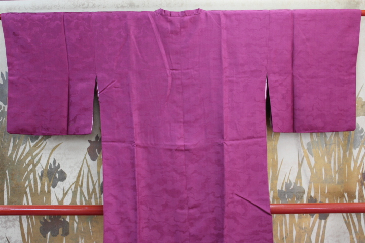 - きもの今昔7015 道行コートコレクション 正絹綸子地雲取り地文様 ワイン色(画像①②が近い) コート丈88cm
