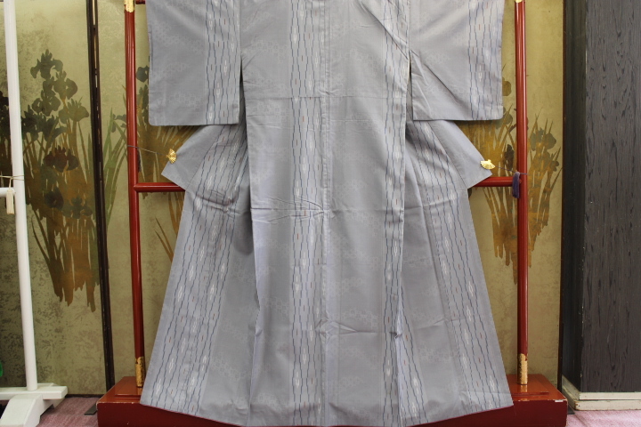 > きもの今昔7031 紬御召きもの 広衿袷手縫い仕立 グレー色絣片柄織 特に目立つ問題なし 身丈160