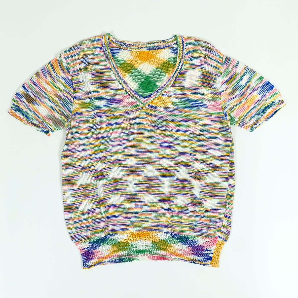 - 1980s ビンテージ ミックスニット 半袖Tシャツ Vネック カラフル アート セーター 古着屋 海外仕入れ ユーロ