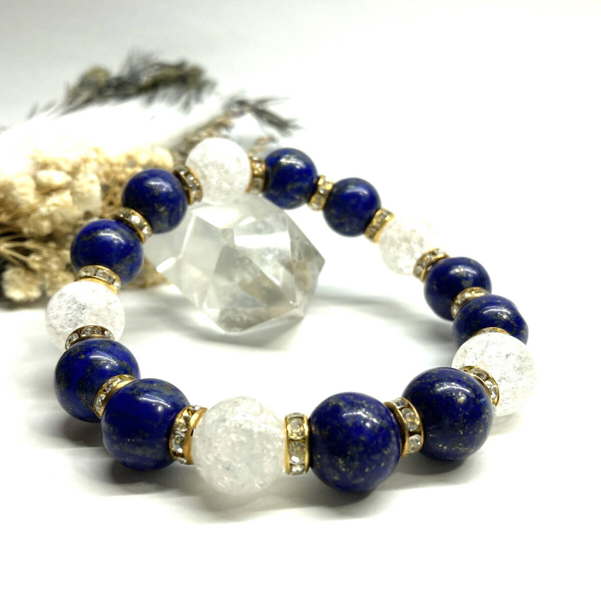 - ラピスラズリ&クラック水晶 パワーストーン ブレスレット 天然石ブレス (ゴールド) 12mm 幸運 開運 メンズ 男性 〇
