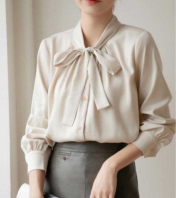 - 春新品/ エレガント ボウタイシフォンブラウス キレイめ 入学式卒業式 ビジネス 長袖 ブラウスシャツ / 杏 /M