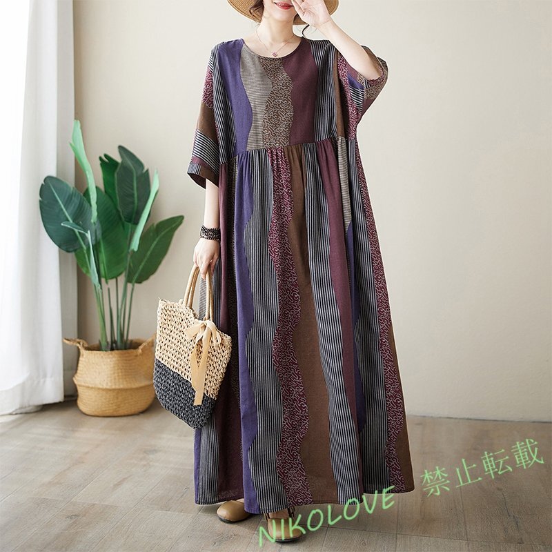 - 新品ゆったり大きいサイズ 丸首 カジュアル 不規則波 切り替え 七分袖 ワンピース グレー系 LE670