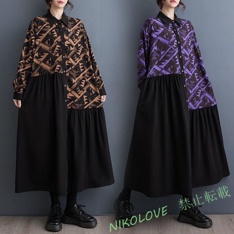 > 新品復古 レディース カジュアル 切り替え プリント 大きいサイズ体型カバー ロング丈 長袖ワンピース 黄色 LE787