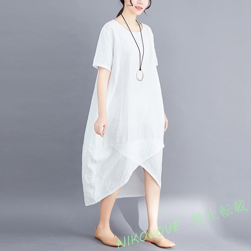 - 新品ゆったり大きいサイズ 丸首 カジュアル じゅんしょく 半袖 不規則 ワンピース ホワイト LH384
