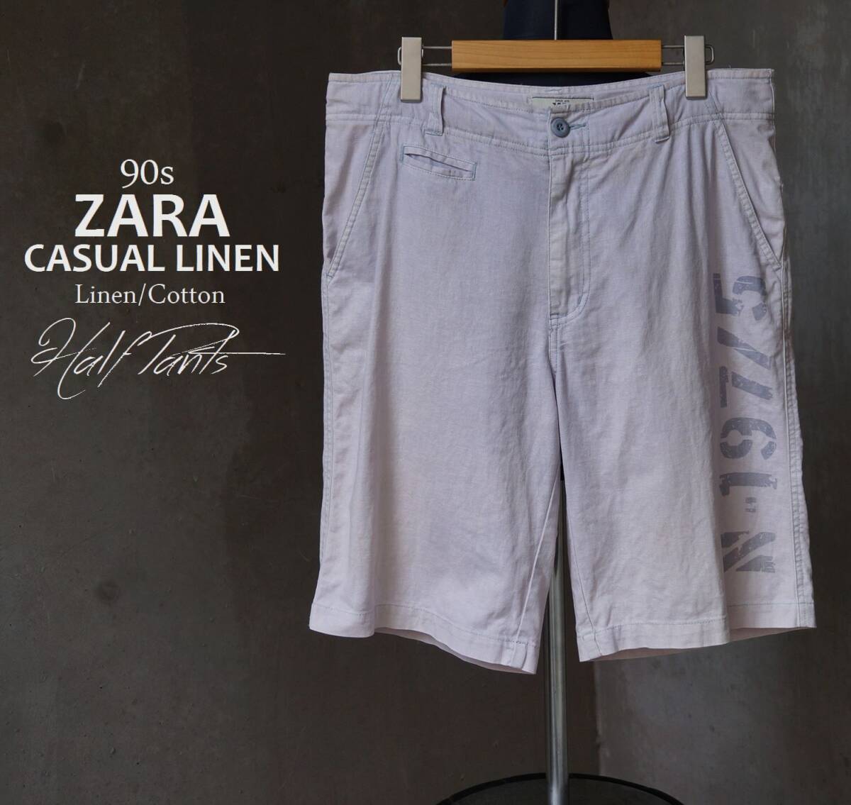 > 90s ザラ ZARA CASUAL LINEN ステンシル N-197/5 ペールグレー 綿 コットン / 麻 リネン ショーツ ハーフパンツ L 40